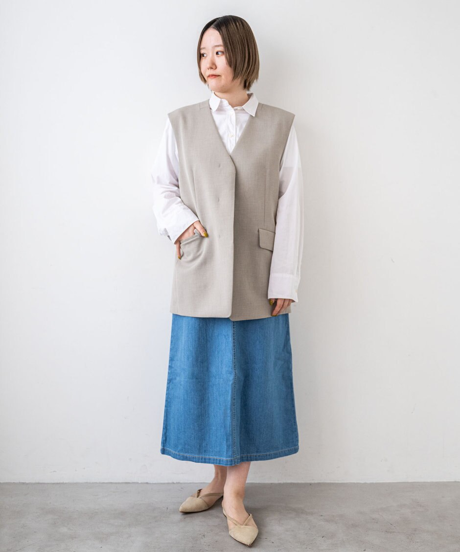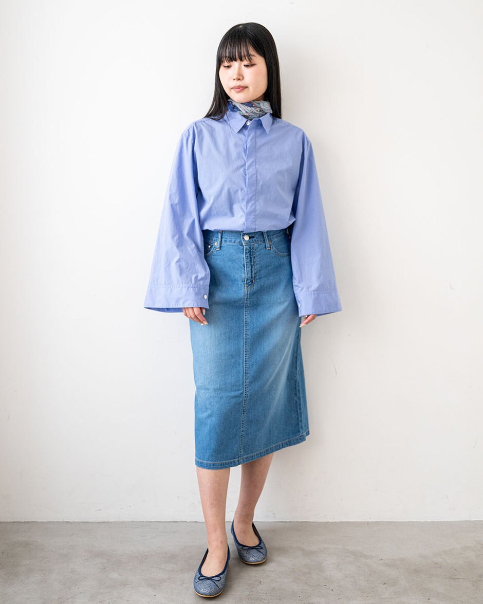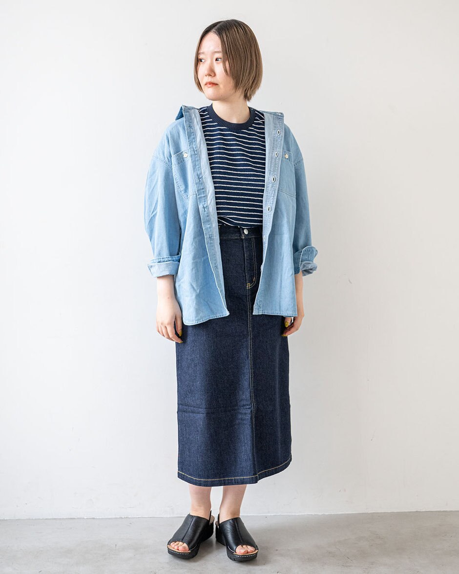 Aラインでくるぶしまでの4/5丈デニムスカート。