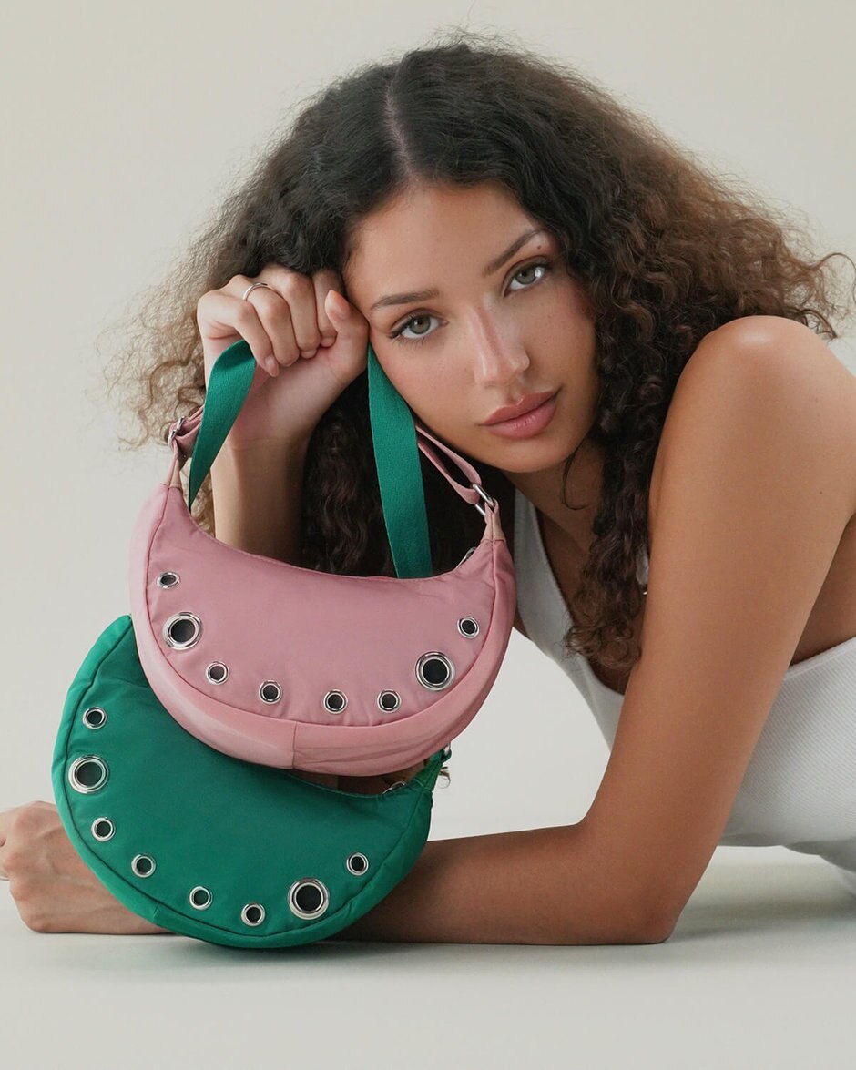 サテンならではの滑らかな肌触りと上品な光沢感で高級感がありながら、メタリックグロメットを大胆にデザインしたエッジの効いたコレクション。
