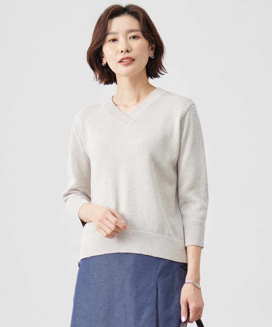 【おすすめポイント】 POINT 01:アームホールが広めで、二の腕部分も安心して着られる POINT 02:身幅が広めで、ボディラインを拾いにくい POINT 03:薄手のニットだがストレッチが効いているので窮屈にならない、シンプルなデザインなのですっきりとした見え感が期待できる POINT 04:トレンド感のある少し短めの丈感だが、高身長さんにもバランスのとりやすい絶妙な丈感です