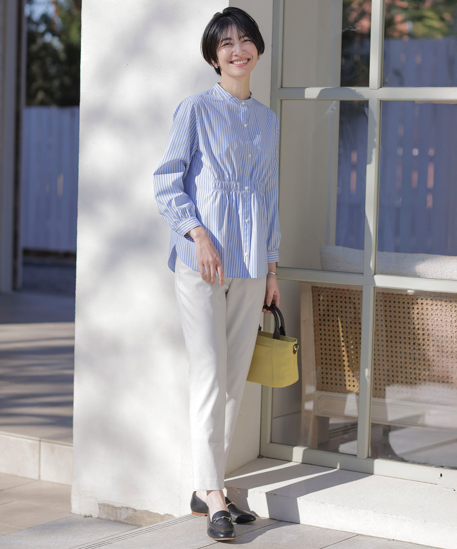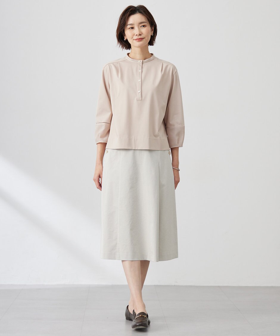【おすすめポイント】 POINT 01:身幅がゆったりめのつくりで、下へ広がるようなシルエットで楽に着られる POINT 02:袖口に向かってふんわりとボリューム袖になっており、手首部分は出すことでよりすっきり見える POINT 03:ブラウスのような素材感だが、ストレッチも効いておりストレスフリーな着心地