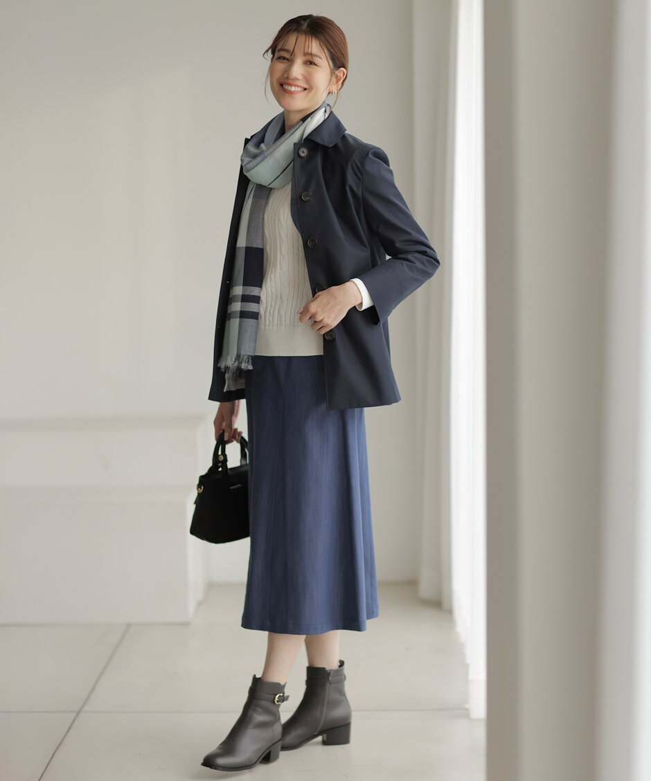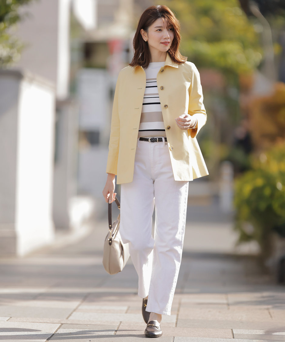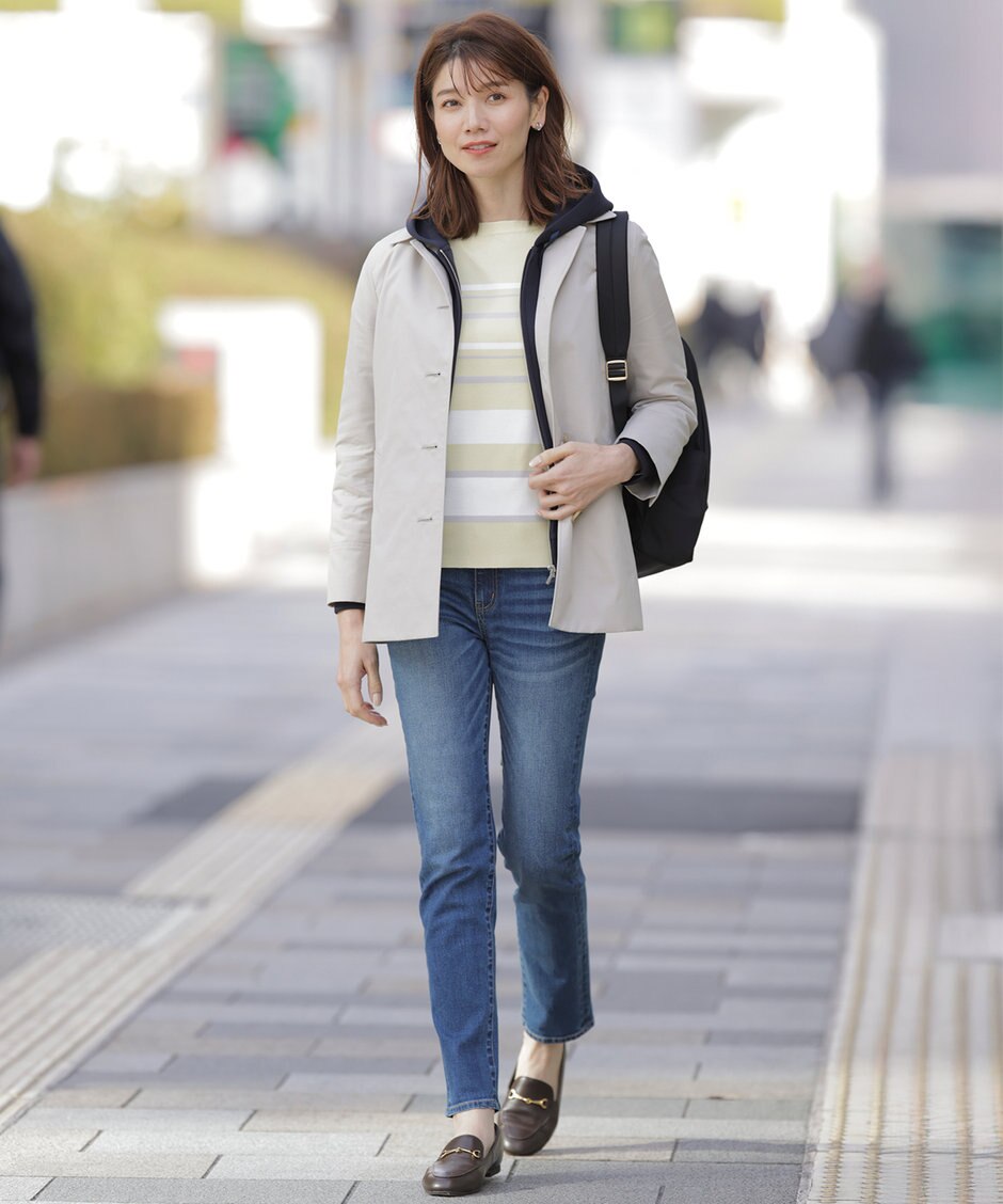 ステンカラーの知的な印象はそのままなので、カジュアルだけでなく通勤シーンにもおすすめ。