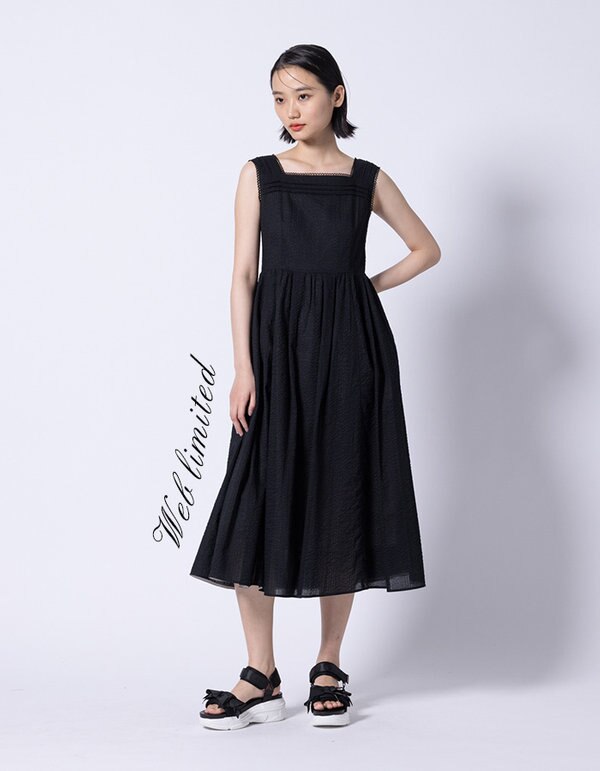 新作の軽やかなサッカー素材のドレスはブラックを選んで大人な雰囲気。襟ぐりと袖のスカラップのレースや、タック使いで甘さもプラス。今の時期は羽織りでレイヤードを、真夏には1枚でさらっと着るのがおすすめです。