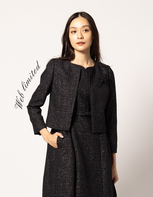 ドレスと同素材のジャケットもご用意しております。緊張度の高いシーンでも困らないジャケットスタイルは、持っておくと使えるアイテム。ドレスにぴったり合う形がワンランク上の装いに。