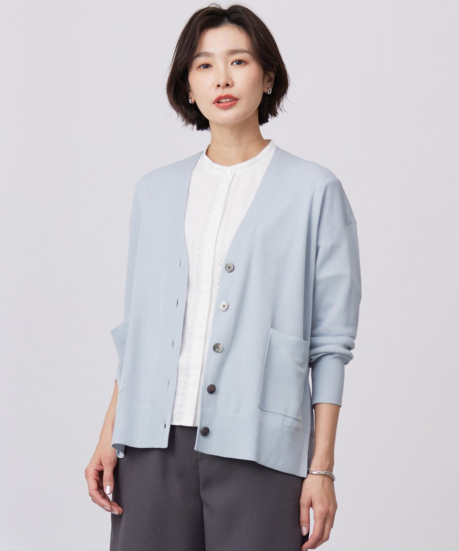 さっと羽織るだけできれいに決まるVネックカーディガン。アームホールにゆとりを持たせつつ、編み続きの襟ラインで大人っぽい印象に。薄手なので夏にもぴったり、冷房対策にも重宝します。レイヤードスタイルや肩掛けアクセントにも大活躍。繊細で光沢のある素材が上品なスタイリングに昇華させてくれるカーディガンです。