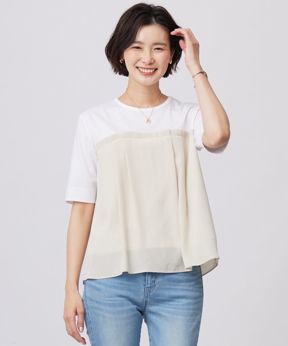 身頃上と袖をジャージ、身頃下を布帛ドッキングした、ビスチェライクのプルオーバー。タックをとって、ゆれるシルエットにし、ほどよいフレアをだしました。トレンド感があり、1枚着るだけでスタイリングが決まる、今年の夏にぴったりのアイテムです。