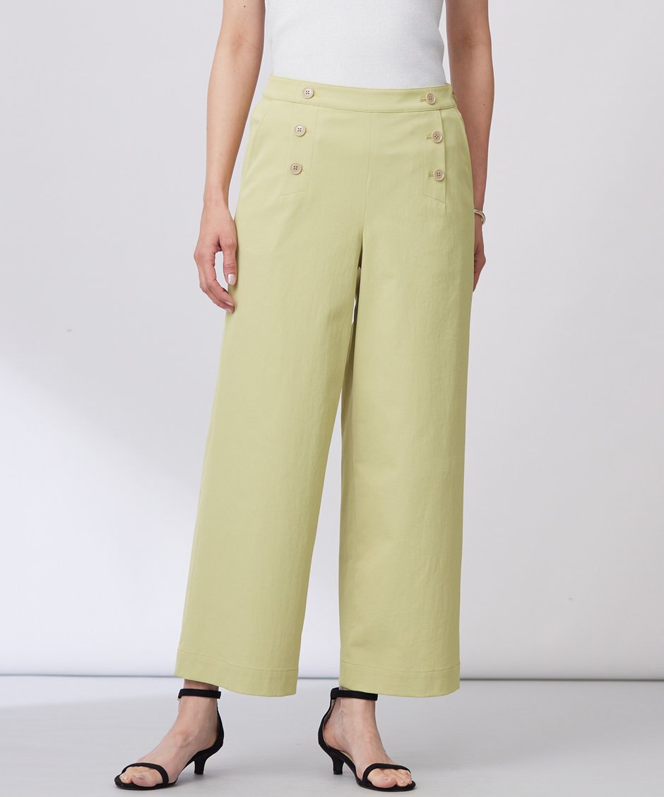 ワイドストレートシルエットのマリンパンツ。フロントのマリンディテールがありつつ、実用性のあるサイドポケットと、着脱のし易いサイドファスナー開き仕様。後ろウェストベルトはゴム入りで伸縮性があり、穿き心地、着心地も◎。素材は、ドライタッチな質感に、接触冷感、防透け、UVケア効果性、吸水速乾性など様々な機能性があるのも嬉しいポイント。