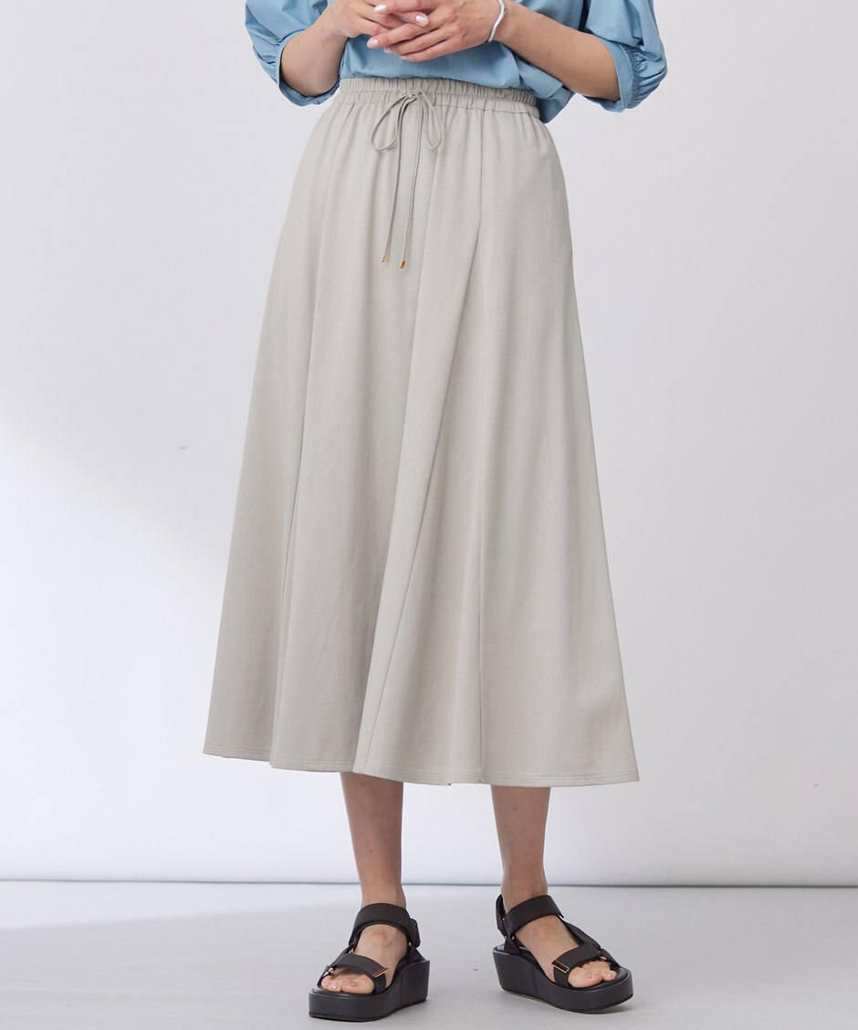 ストレスフリーな着心地がポイントのフレアシルエットのスカート。裾にマチをつけることで、腰回りはすっきりとし、きれいなフレアが広がるシルエットに仕上げました。着心地は楽ちんなジャージ素材ですが、カジュアル見えし過ぎない1着です。ウエストはゴムが入っていますが、ヒモでも調節していただけます。