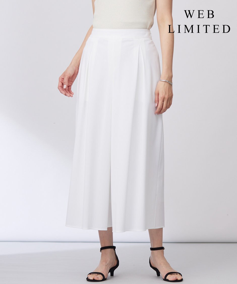 センターフロントに突き合わせタックを入れ、股上を見えにくくしたタックスカート見えのフレアーパンツ。さらっとした素材なので、穿き心地もよく、暑い季節でも快適な素材感でデイリーに活躍します。分量あるけ回しがエレガントさを出し、春の女性らしいコーディネートに役立つアイテムです。