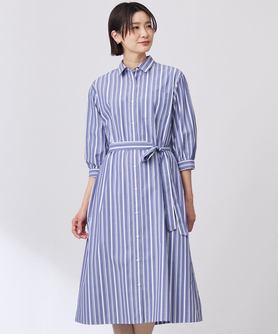 程良いハリ感がありながらも、軽やかで快適な着心地が魅力のシャツワンピース。前を開けて羽織りとしても着用できる2WAY仕様で様々なスタイリングが楽しめます。ウエストをベルトでマークすれば、より女性らしいシルエットに。素材は、接触冷感性とUVケア効果があり、ポリエステル混のため、綿100%よりシワになりづらいのが特徴。オンオフ問わずに活躍する万能な1着です。