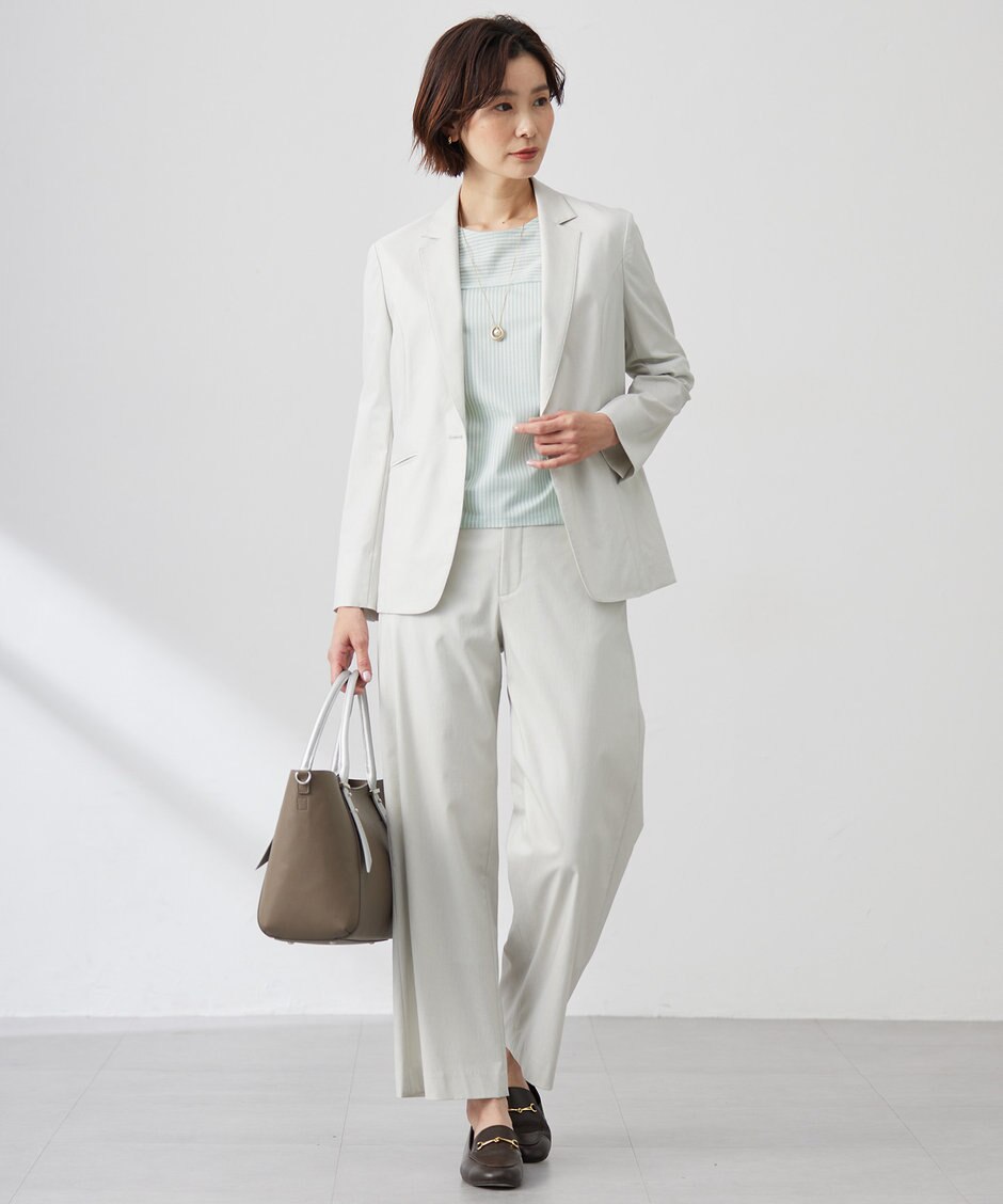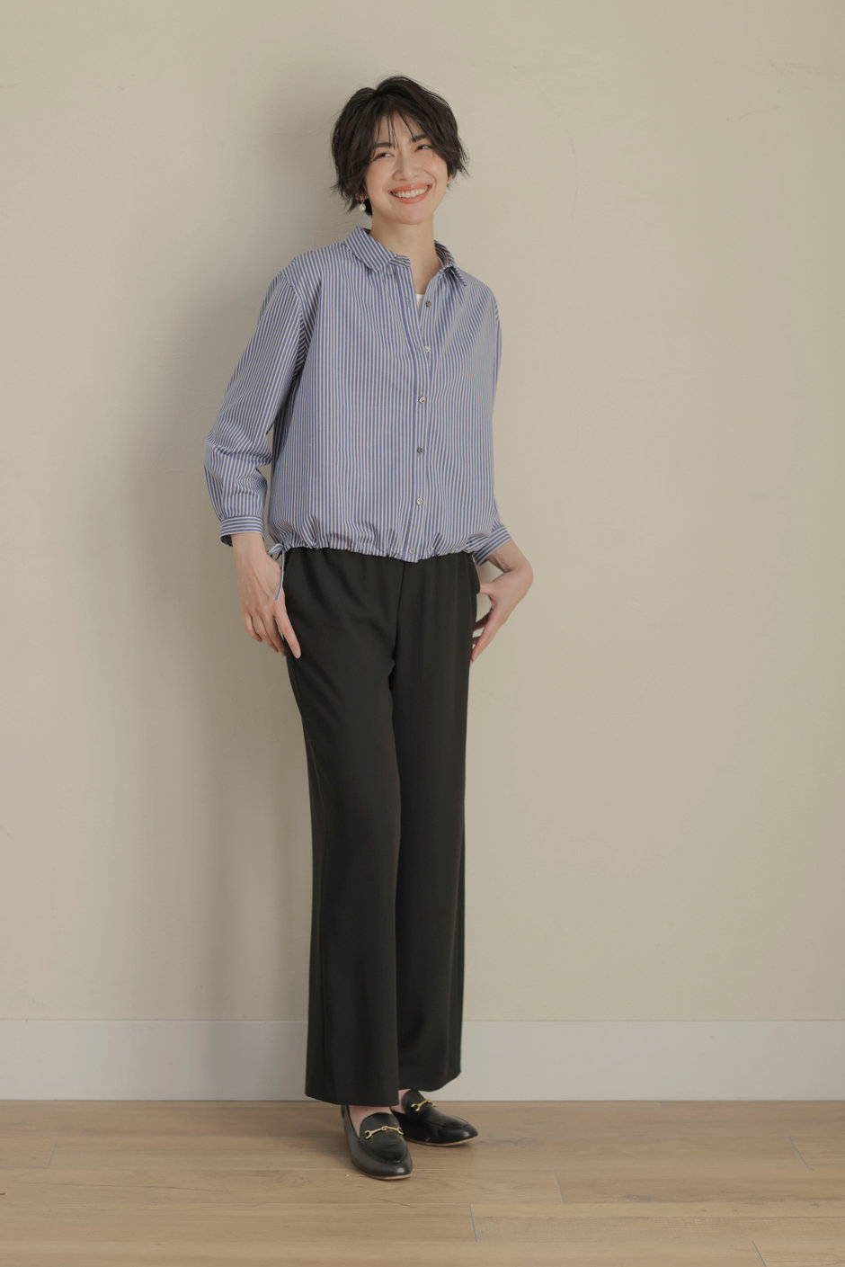 プルオーバータイプのストライプ柄カットソー。前身頃に切り替えデザインを施し、シンプルでありながらさりげないアクセントをプラス。袖や裾部分にタックを入れ、着用すると程よく立体的なシルエットになり、体のラインをカバーしてくれます。一枚着としてはもちろん、アウターのインナーやお仕事着としても使いやすく、繊細なストライプ柄が映えるアイテムです。素材は、ブラウスのような見え感できちんと感のある素材を使用。ソフトで柔らかな肌触りで、カットソー特有のストレッチ性もあり、着心地の良い素材です。しわになりにくく、デイリー使いしやすいのも魅力です。