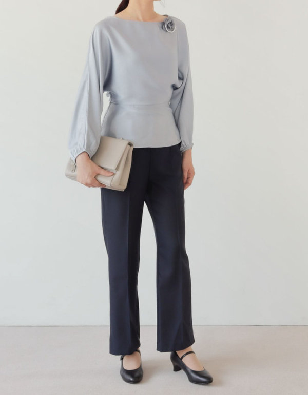 光沢感のあるブラウスに繊細なコサージュを添え、華やかさを演出。
