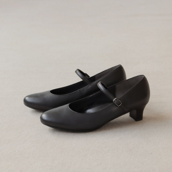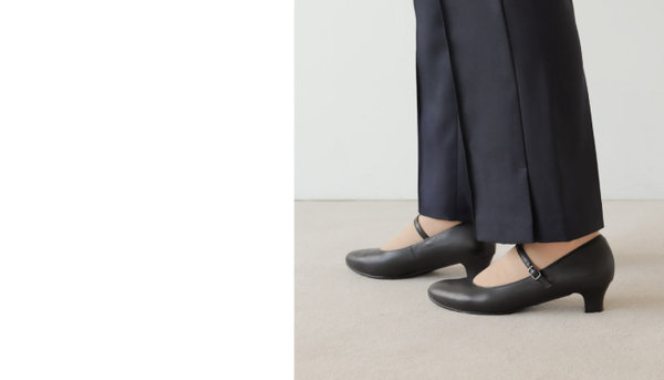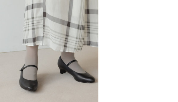 シンプルなブラックのメリージェーンパンプスは、足元にさりげない変化をもたらす一足。