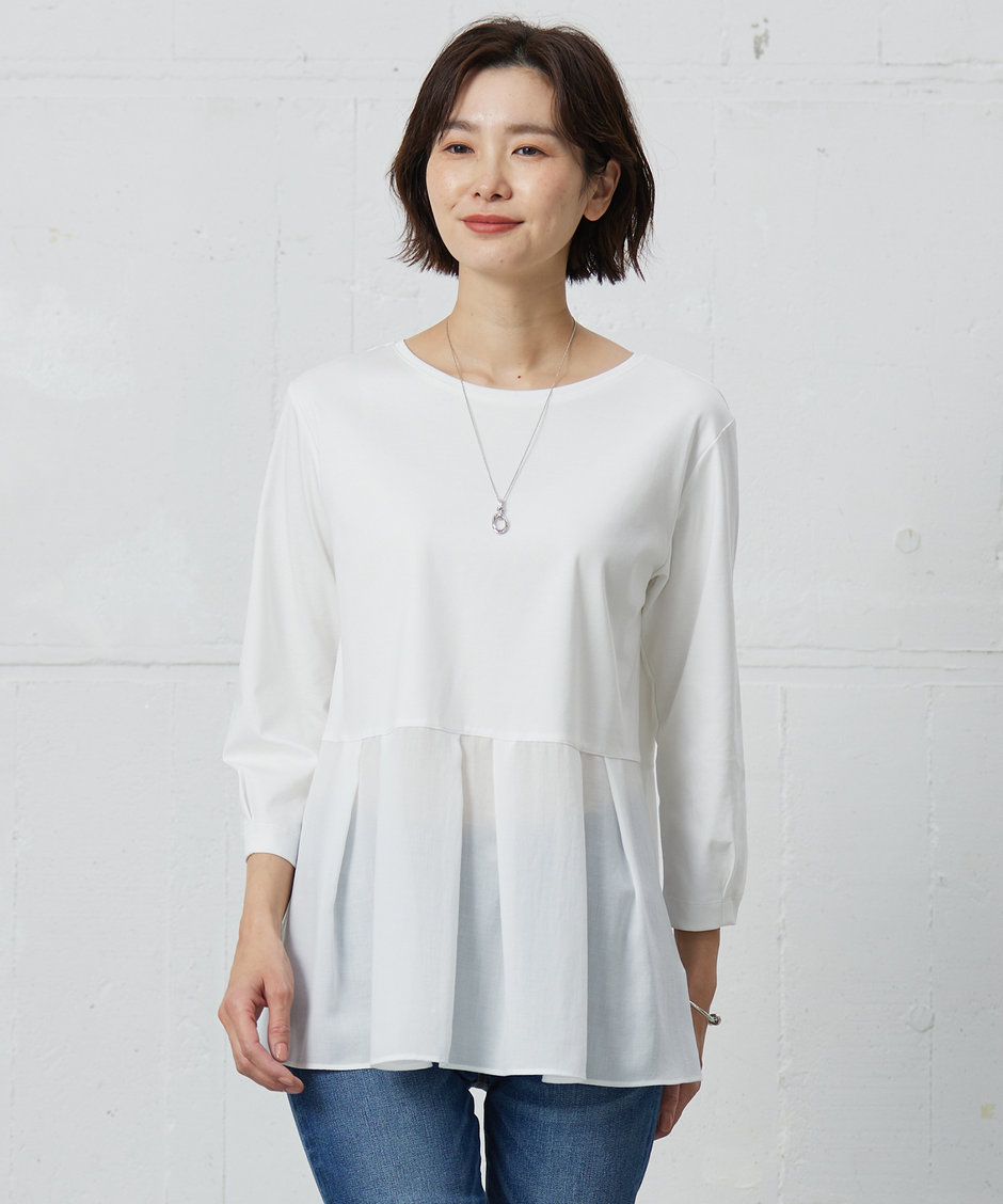 春のレイヤードスタイルにおすすめ!甘すぎない大人のフレアーカットソー。上身頃にジャージ素材、裾部分にほんのり透け感のある別布を組み合わせています。ふんわりとしたシルエットに仕上げているため、裾のフレアー部分が気になるお腹周りをカバーしてくれるのも嬉しいポイント。お手持ちのニットベストやカーディガンのインナーに合わせるだけで、普段のスタイリングを簡単にこなれた印象にアップデートしてくれるアイテムです。