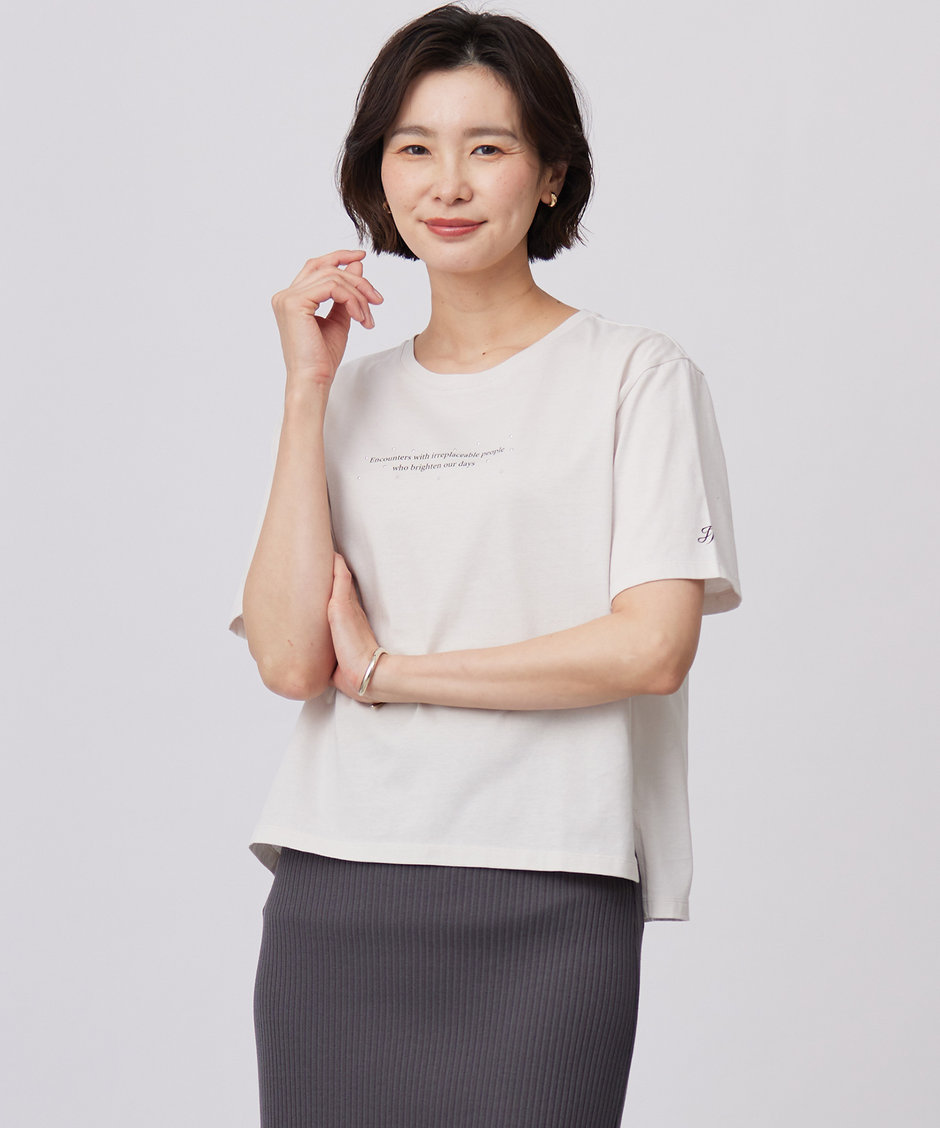 すっきりとしたシルエットで、インナーとしても活躍するロゴTシャツ。左袖口には、J.PRESSワンポイントロゴをプリントし、前身頃には、「日々を輝かせる、かけがえのない人々との出会い」を意味するメッセージを込めたロゴをプリントしました。ジャケットやカーディガンと合わせた際に見えるロゴもポイントに。シアーな羽織りなどにもきれいに合わせられるアイテムです。