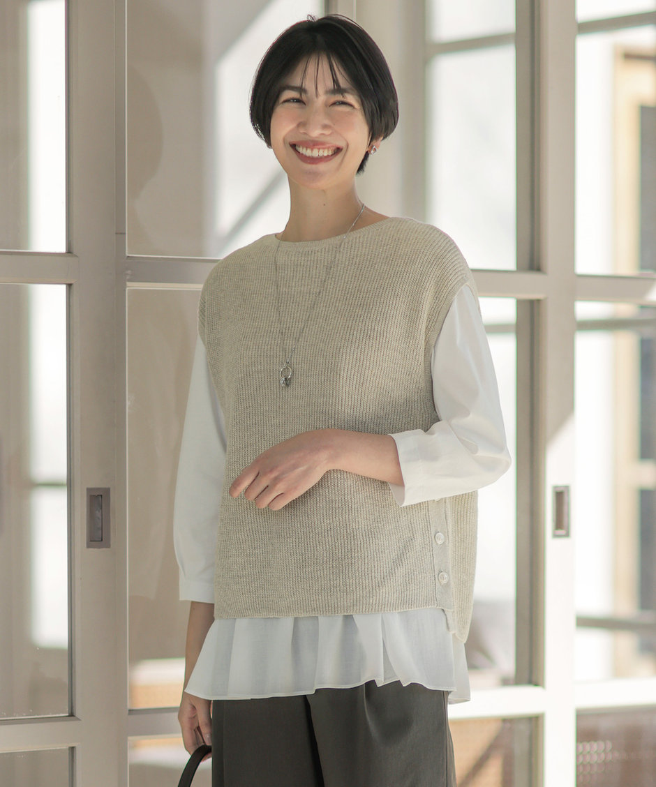 左脇のボタンディティールがポイントのニットベスト。程よくドライタッチで、春の立ち上がりに適した風合いの素材です。前後差をつけたサイドのスリットに、左脇釦の開閉でスリットの空き具合を調整できるのがポイント。カットソー合わせてカジュアルに、シャツブラウスを合わせてきれい目にレイヤードを楽しめます。