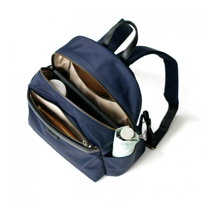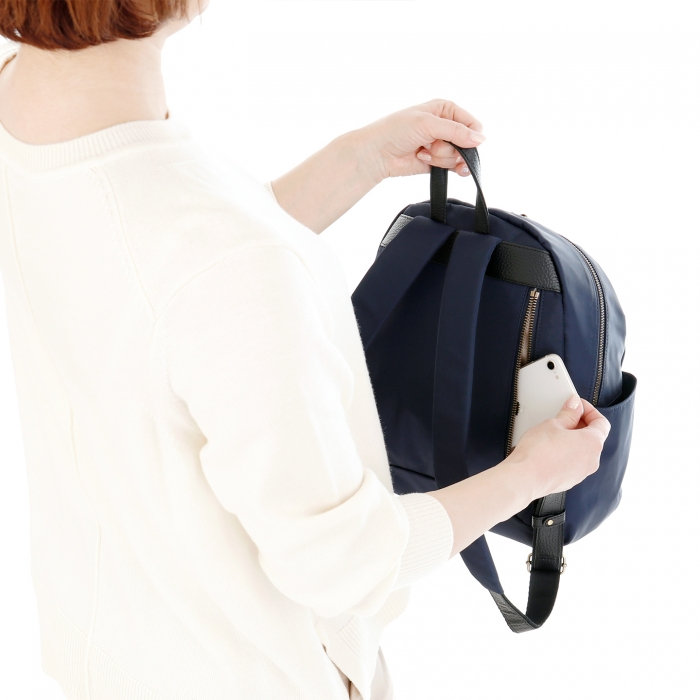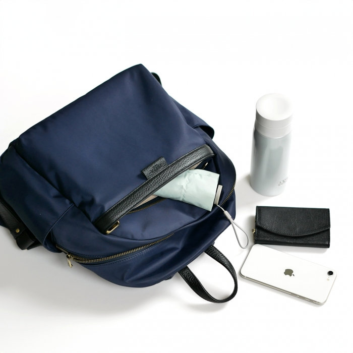 フロントのマチ付きポケットが特徴のリュックは、使いやすさにこだわった設計が魅力。折りたたみ傘や長財布が収まる大きめのフロントポケットに加え、左右のサイドポケットや背面ポケットなど、必要なものをすぐ取り出せる工夫が詰まっています。ファスナーの角度や位置にも気を配り、荷物の出し入れもスムーズ。見た目はコンパクトでも収納力はしっかり。旅にもお仕事にも頼れるアイテムです。