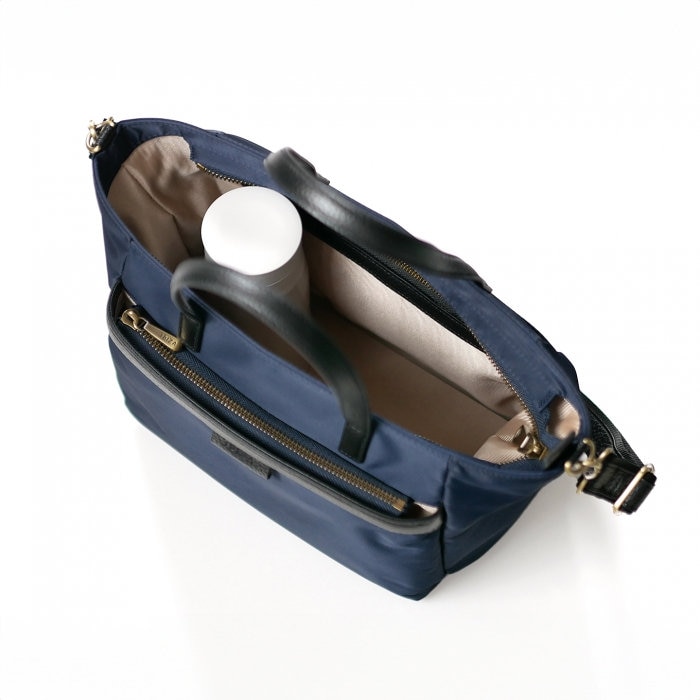 350mlボトルが縦に入る広めのマチ。メイン収納もたっぷり。