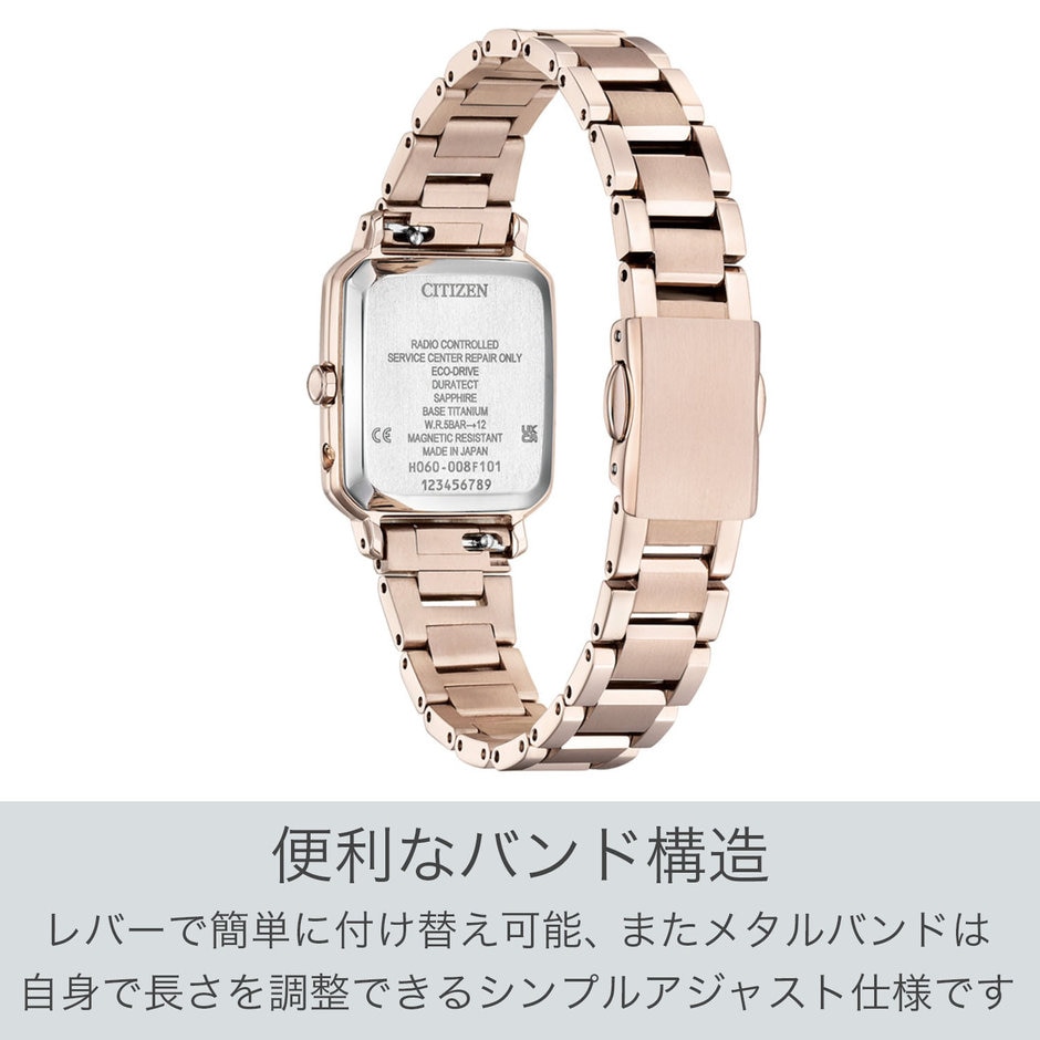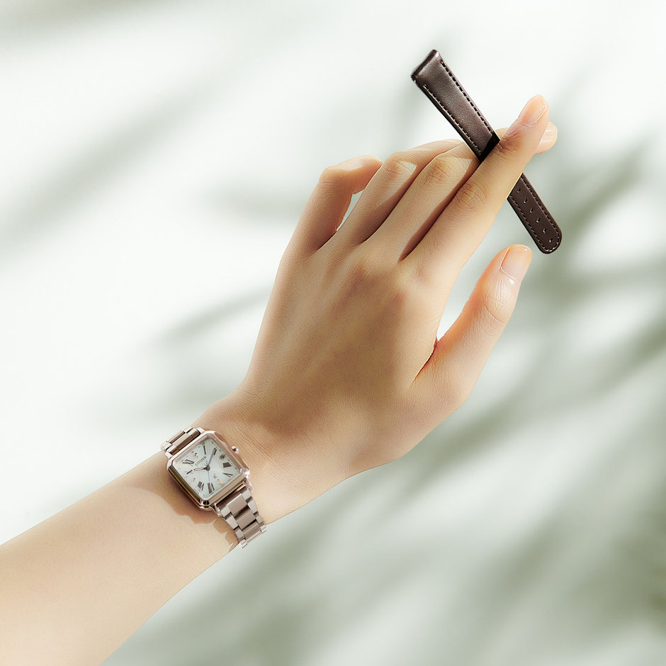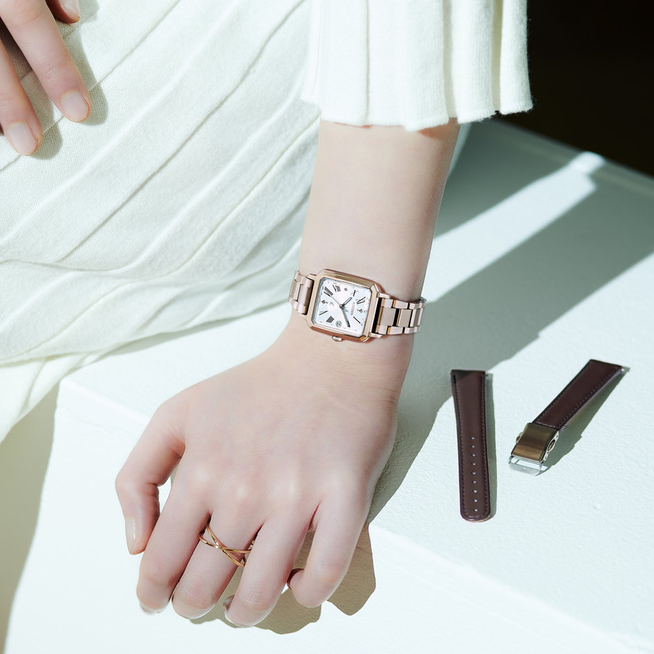 シーンに合わせて印象が変えられる付け替えバンドがセットされています。ご自身で付け外しができるので、ギフトにも適しています。しっとりと美しいSakura pink®。替えバンドには環境に優しいECOPET®のブラウンをセレクト。落ち着いた華やかさで、どんな服装にもなじみやすい組み合わせです。