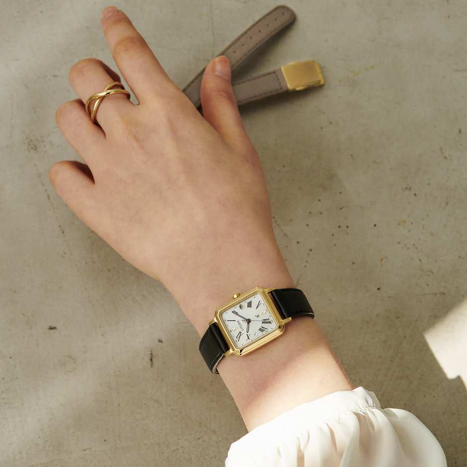 華やかなイエローゴールド。環境にやさしい植物由来(リンゴ)のバンドをセレクト。フォーマルなブラックと優しいグレージュ、まったく印象の違う2つの表情が楽しめる組み合わせです。