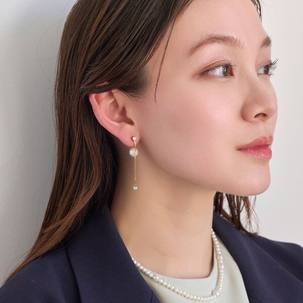 バックキャッチピアス風イヤリングで、動くたびに揺れるモチーフと耳たぶの後ろからのぞくパールが、耳周りを華やかに演出します。