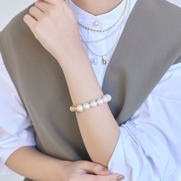 【パール×メタルのボリュームブレスレットで手元にアクセントを♪】