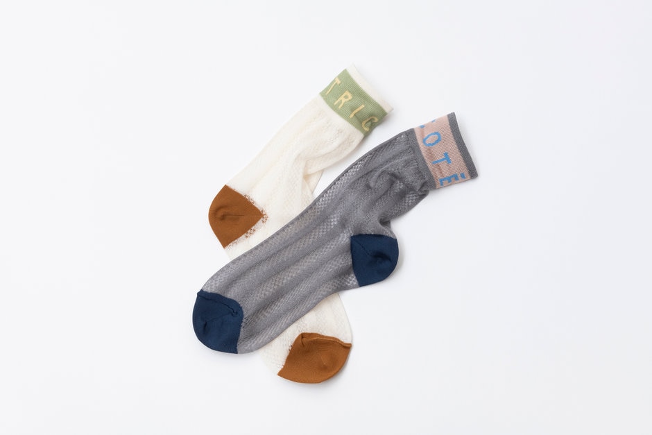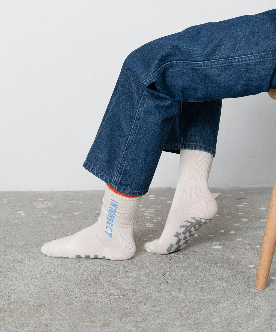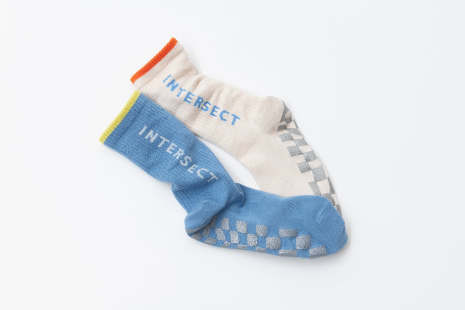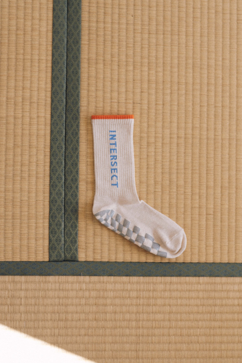 2025SS collection テーマ ”INTERSECT”のメッセージが入ったソックス。レーヨンとシルク混の、肌触りの良い素材を使用しています。