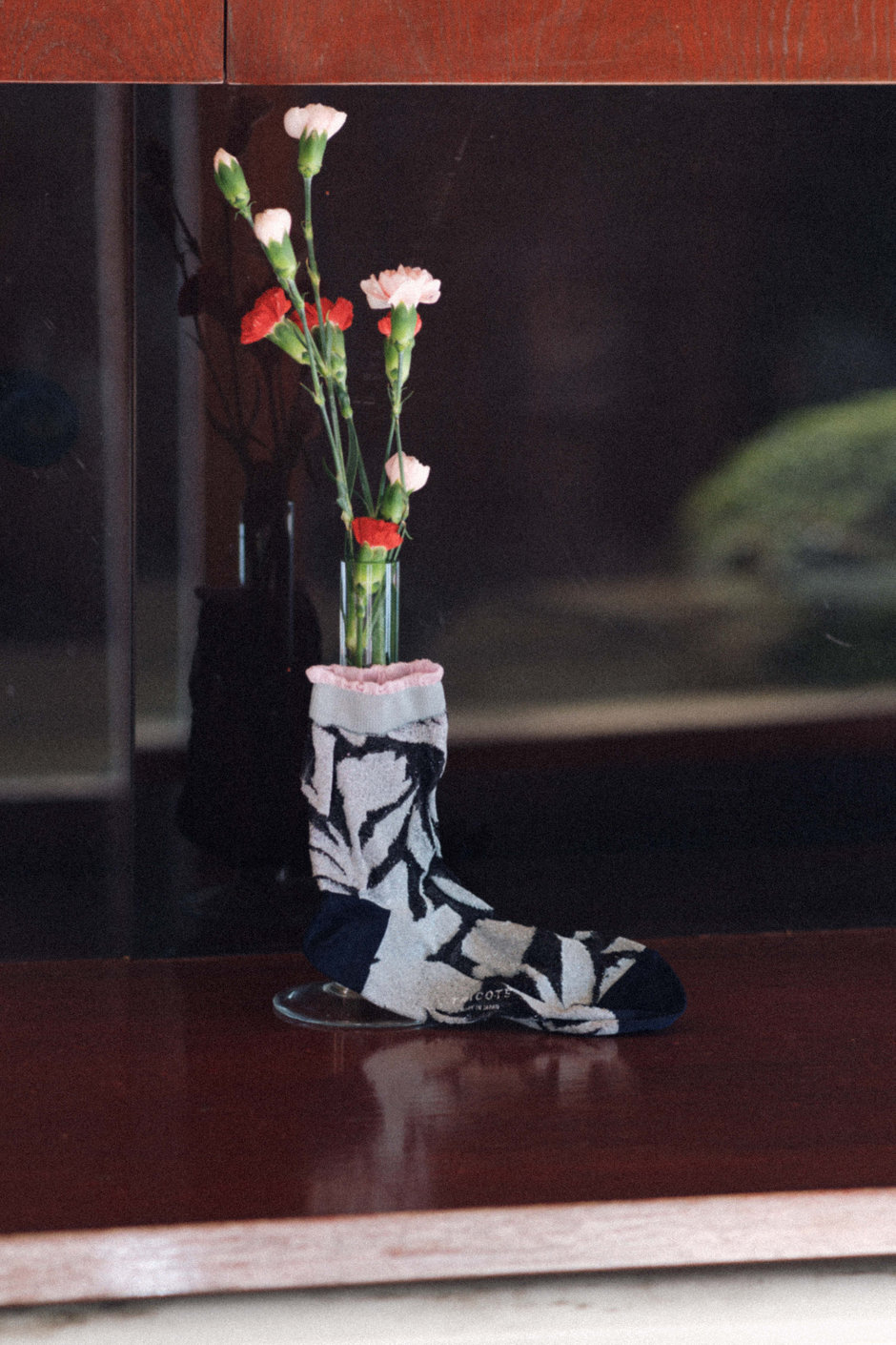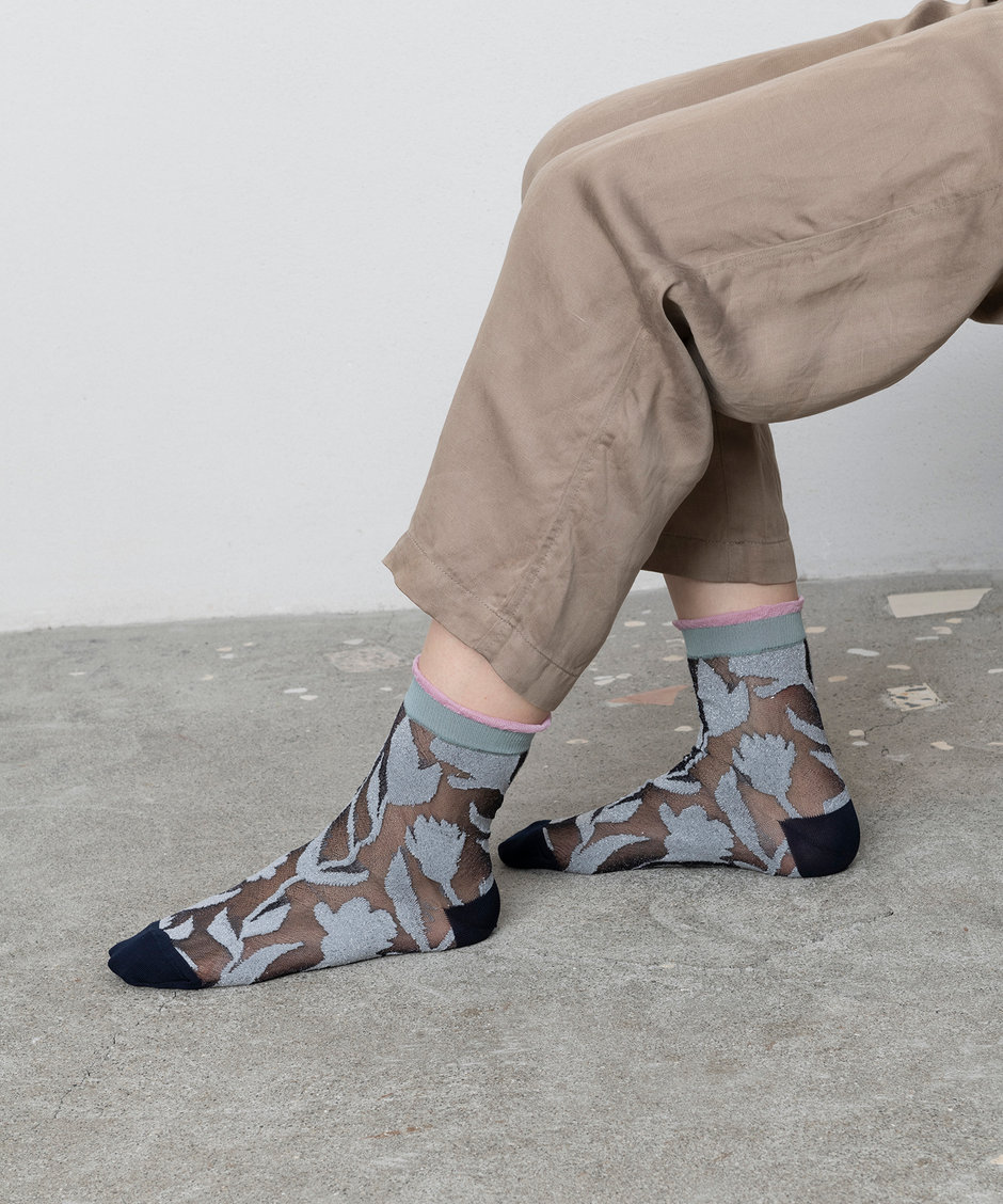 シアー素材をベースに、花柄のシルエットがデザインされたソックス。さりげないアクセントになっているフリルの履き口は、足を締め付けにくく、肌あたりが優しくゆったりとしています。