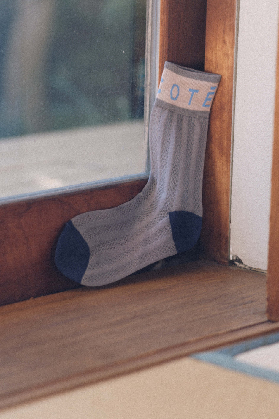 履き口にブランドロゴをあしらった、スポーティな印象のソックス。やや光沢感のある素材を使用し、ストライプ柄の部分は荒めのメッシュ組織を使用しています。