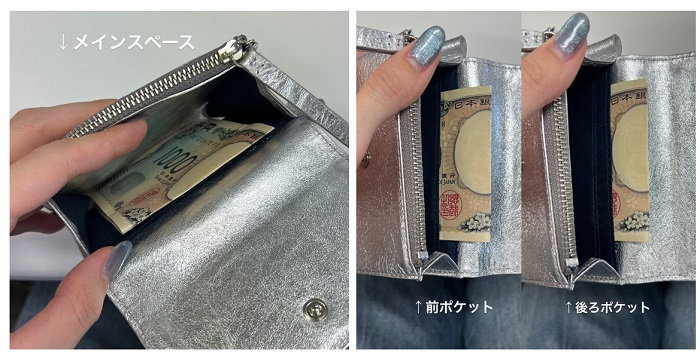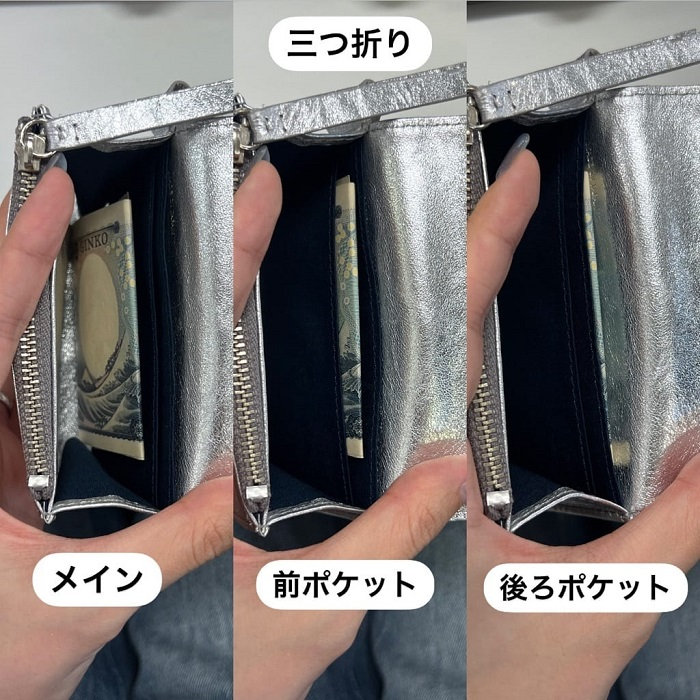 メインのスペースは二つ折りでも入りますが、ポケット部分からははみ出てしまうので三つ折りがおすすめです◎