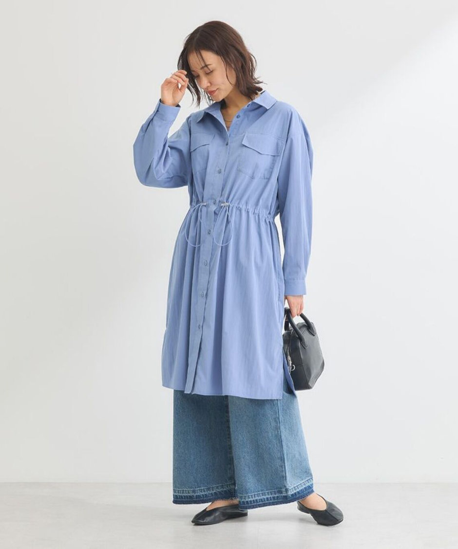 胸元切替にドロストを加え、広がりすぎないすっきりとしたAラインがクールな印象です。