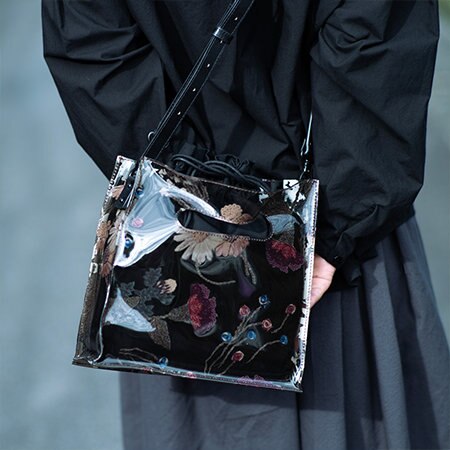 刺繍の立体感をそのまま閉じ込めたデザインは、クリアバッグのチープなイメージを覆し、大人の装いにも自然に馴染む上品な仕上がりに。