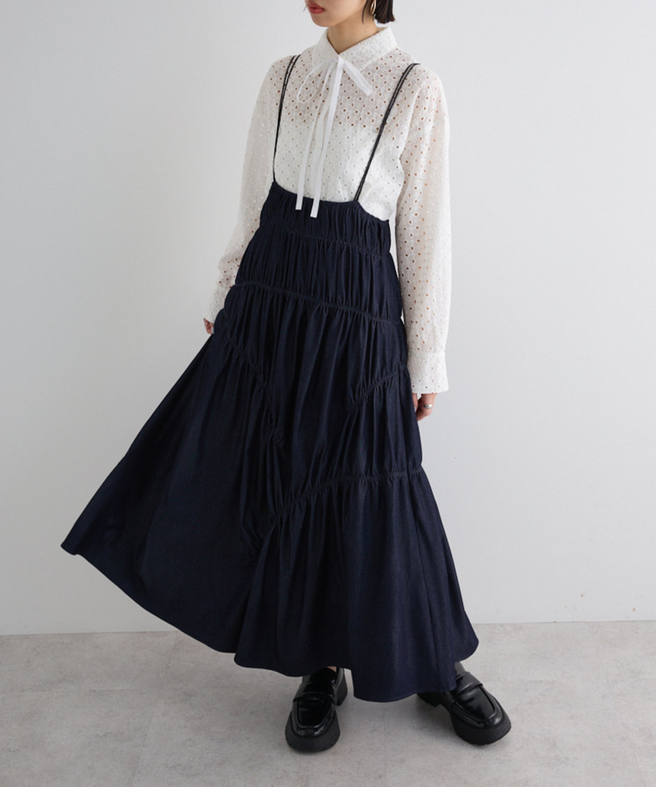・やや長さのあるミディ丈に、ウエストリボンを結ぶとシルエットの変化も楽しめる魅力的なデザインです。