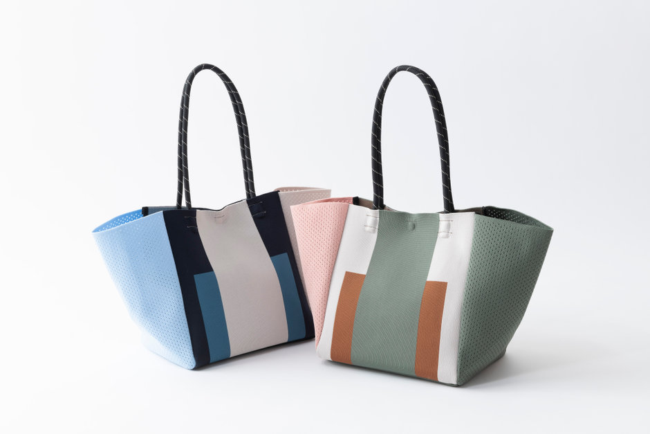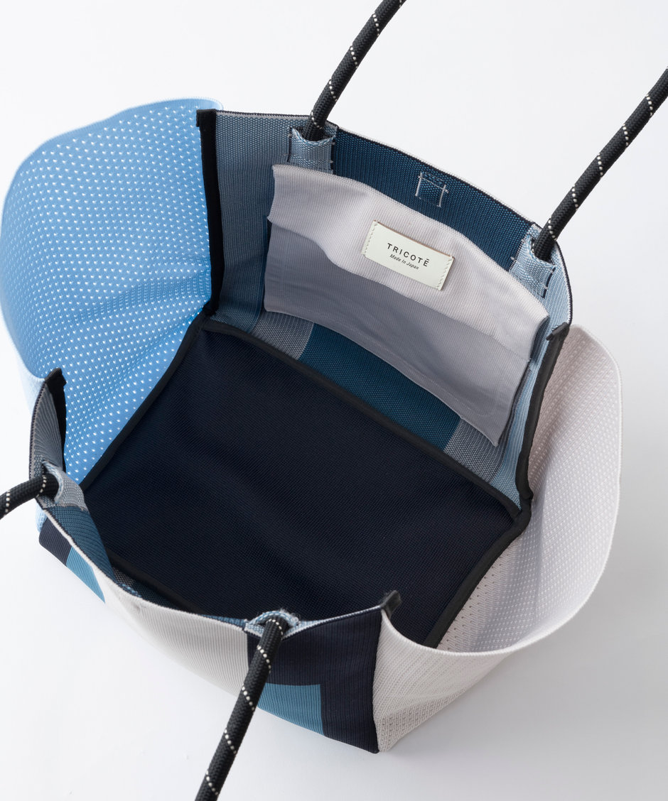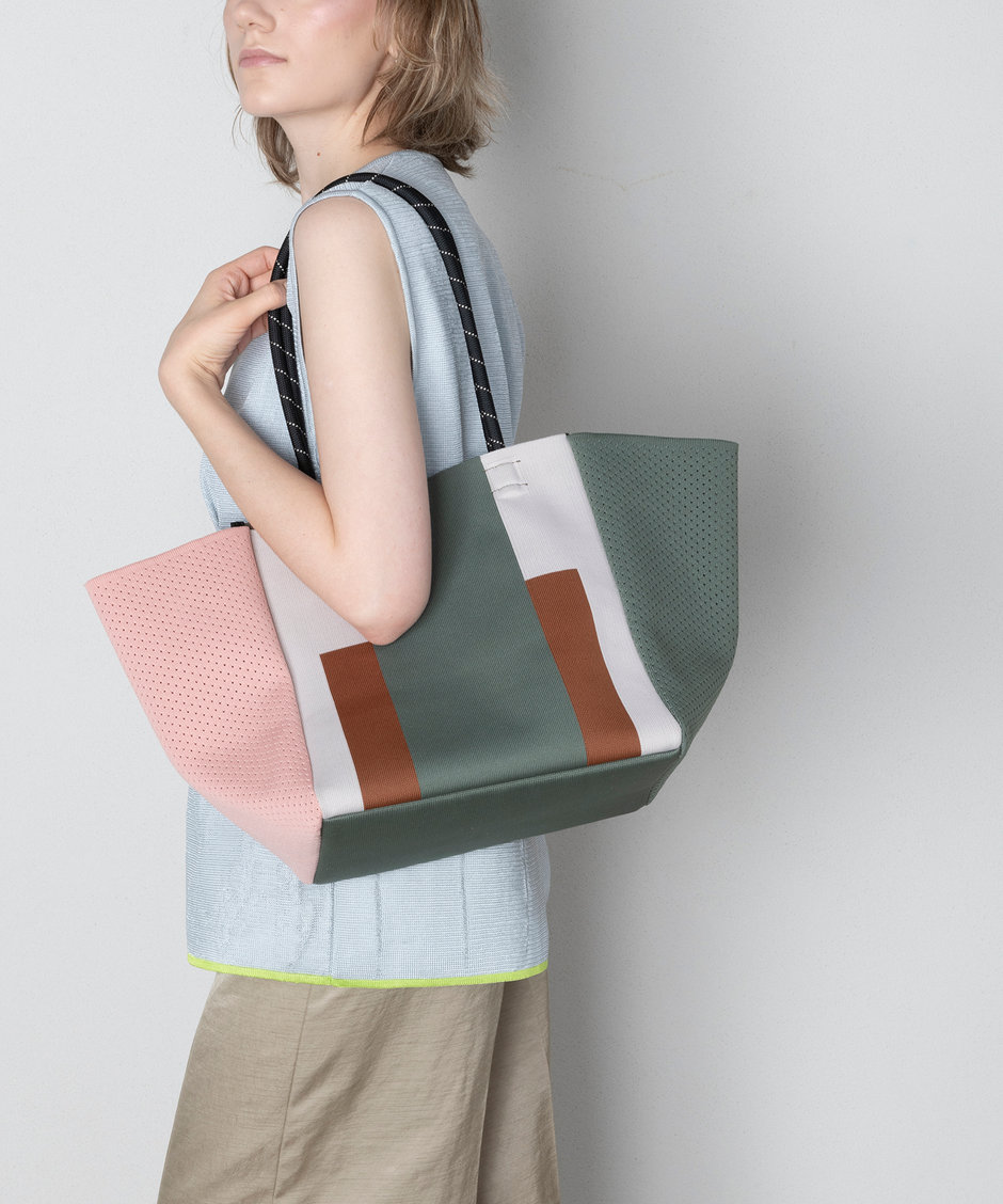 定番商品のサイドメッシュトートバッグの新しいデザイン大胆な配色のブロックカラーはシンプルかつ、アクセントになるカラーリングです。