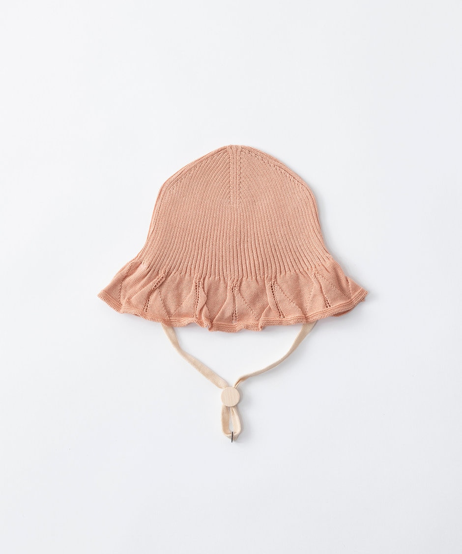 ニット地のオーガニックコットン素材を使用したボンネット。