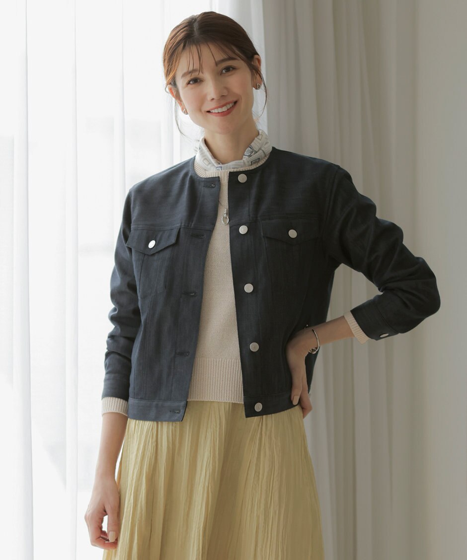 セルロースシャンブレー ノーカラー デニム ジャケット