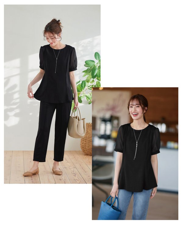 お袖のシフォンジョーゼットの透け感がとっても涼し気なカットソートップスです。