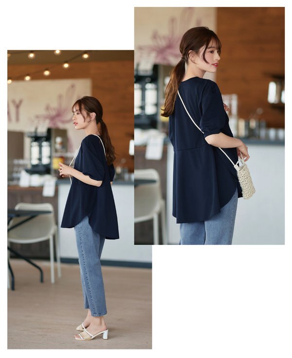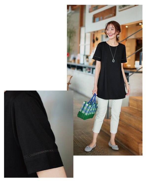癖のないラウンドネックで着用しやすく、身頃の切り替え位置でスタイルよく見せてくれます。