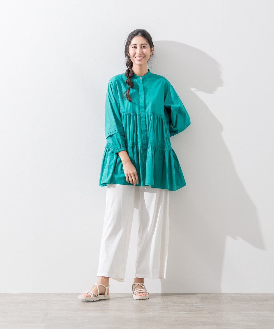1枚で着映える長めレングスのティアードブラウス。裾に向かってふわっと広がるシルエットが華やかな印象。