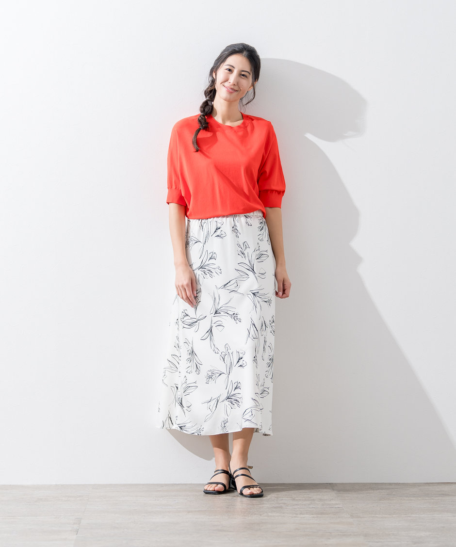 Iラインのシルエットですっきりとしながら、ウエストゴムのストレスフリーな1枚。