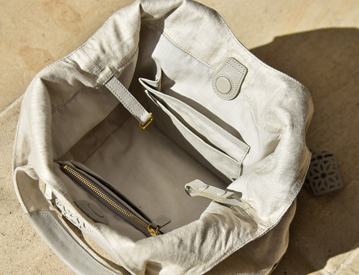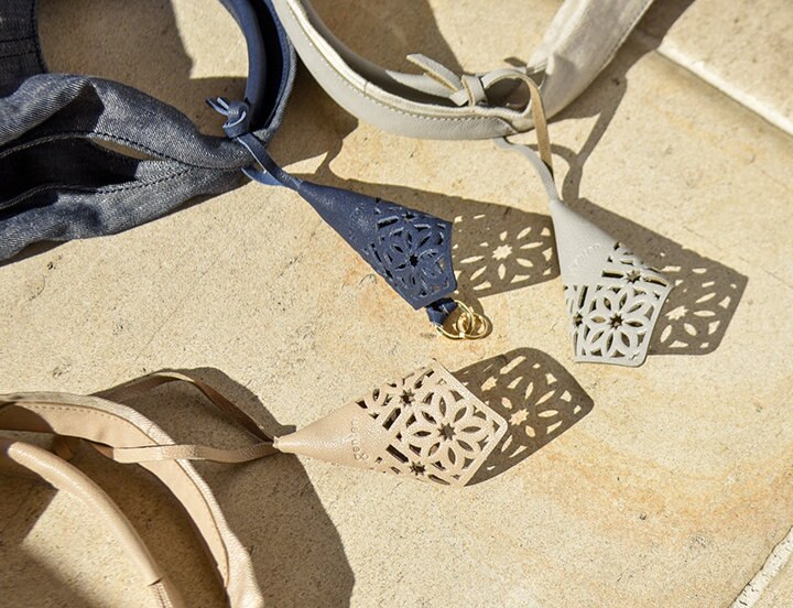 ナチュラルな風合いの生地で丸みを帯びたフォルムに仕立てた「リノ」。バッグのカタチそのものはスタンダードですが、4枚の革を丁寧にはぎ合わせた底面が顔を出すデザインが特徴的です。その革をカットワークで縁取ると、アラベスクタイルのような趣きになりました。より軽快で涼し気な印象が漂います。