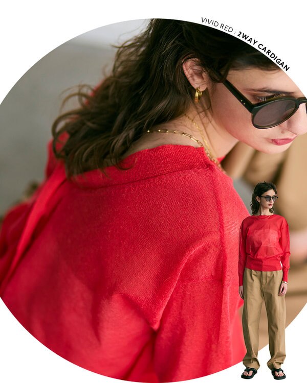 ビビッドな赤もシアーアイテムならちょうどいい。