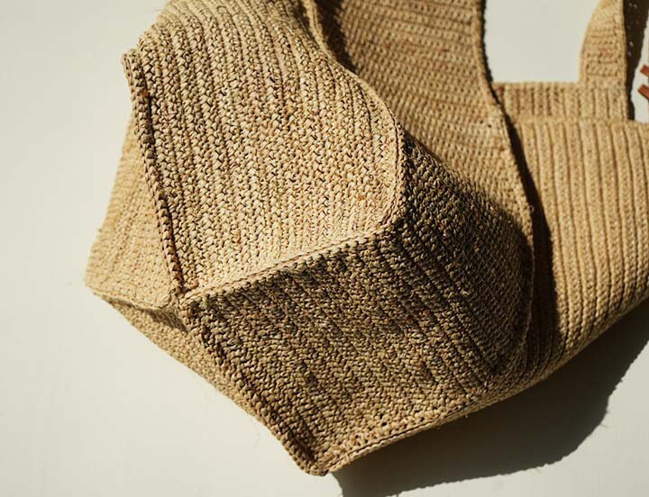 パネル状に編んだラフィアを 4枚つなぎ合わせた新発想のバッグ