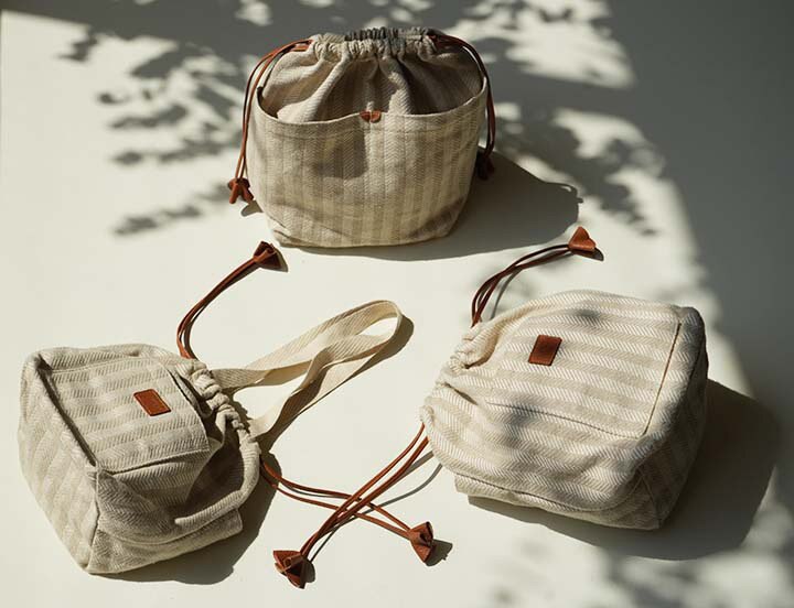 コットンリネンのやわらかなテープハンドルが付いているので、巾着そのものもバッグとして使うことができます。旅先などで荷物が増えたときなどもサブバッグとして活躍。