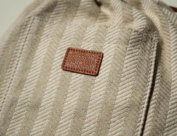内巾着の素材はコットンリネンのヘリンボンジャカード。口紐やポケットにあしらったプレートなど、革をところどころに使ったgentenらしい巾着です。