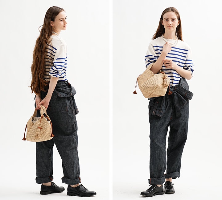ラフィアのバッグのみ、中に巾着をセットして、巾着単体で。シーンに合わせて楽しめる3WAY仕様です。