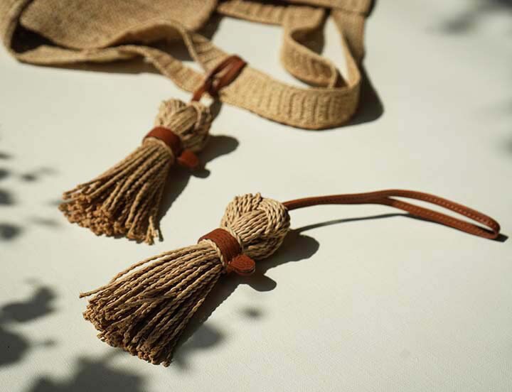 どの型も遊び心がのぞくフリンジのチャーム付き。丁寧に撚ったラフィアを束ねて仕立てたgentenオリジナル。手軽に取り外しができるので、ほかのバッグに付けても楽しめます。