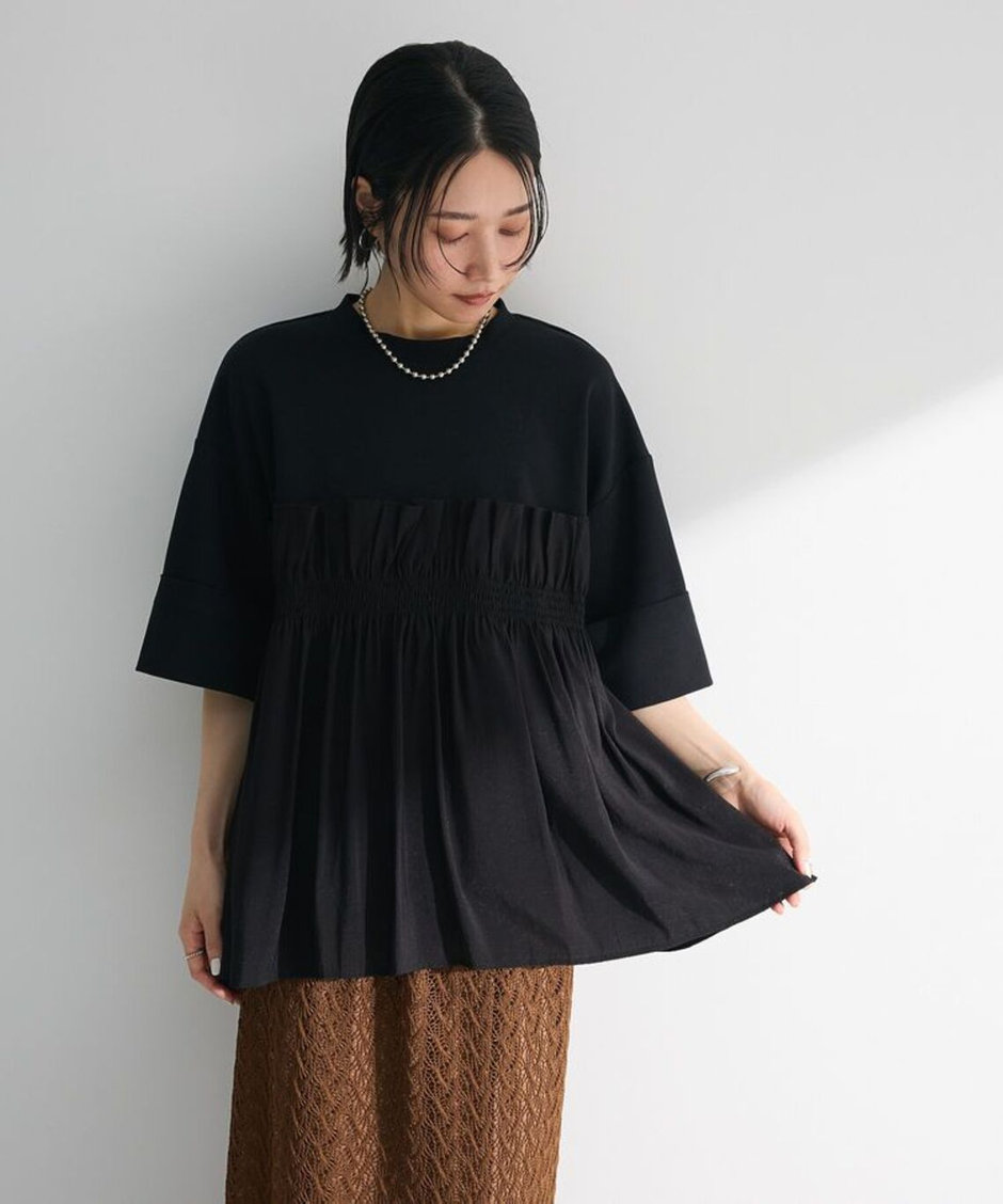 異素材の切り替えとティアードデザインが特徴的な1枚。