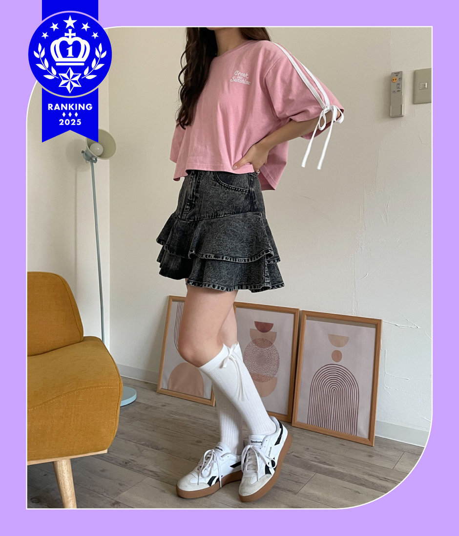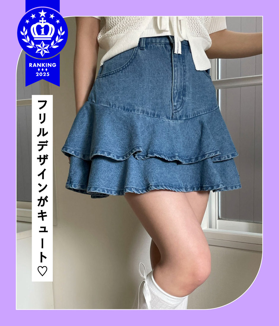 しっかりとしたデニム素材ながら、動きのあるフリルが女性らしさをプラス。