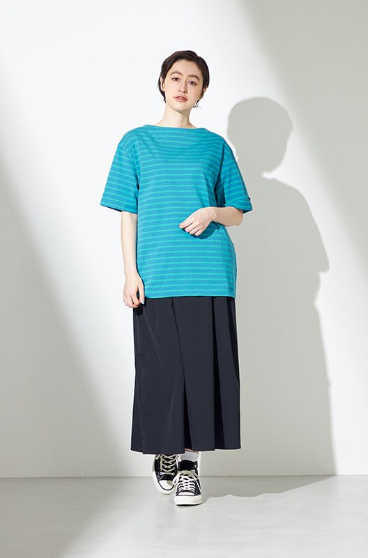 オーセンティックなボートネックのデザインに、さまざまな機能性をプラスしました。表側がコットン、裏側がリサイクルポリエステルになるプレーティング天竺編みで仕上げた生地を使用することで、ナチュラルな見た目と吸汗速乾性を兼ね備えているのが魅力。やや薄手に仕上げた度詰めタイプで、見た目より軽やかな風合いになっています。ニオイ対策として、抗菌防臭のポリジン・ステイフレッシュ加工を採用。UVケア(UPF15-30、紫外線カット率85%以上)機能付き。ネックラインの内側に襟吊りが付いています。環境への負荷に配慮して、素材の一部にリサイクル糸を使用しています。