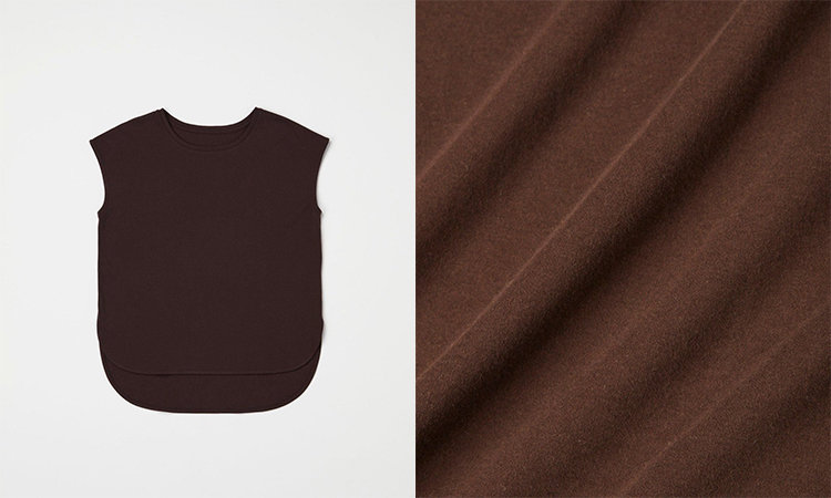 肩をドロップさせたデザインに加え、ラウンドさせた裾を前後で差をつけることで、着用時に背中が出るのを防ぐのと同時に、ヒップ回りをカバーしてくれます。
